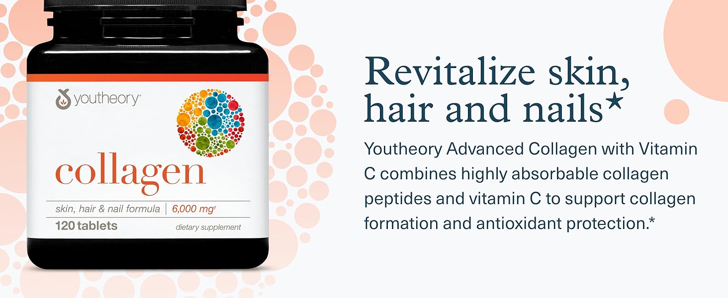 Youtheory Advanced Collagen provides 6,000 mg of hydrolyzed collagen peptides combined with Vitamin C to support healthy hair, skin, and nails. This advanced collagen formula is perfect for both women and men seeking to reduce the signs of aging, enhance skin elasticity, and promote stronger hair and nails.